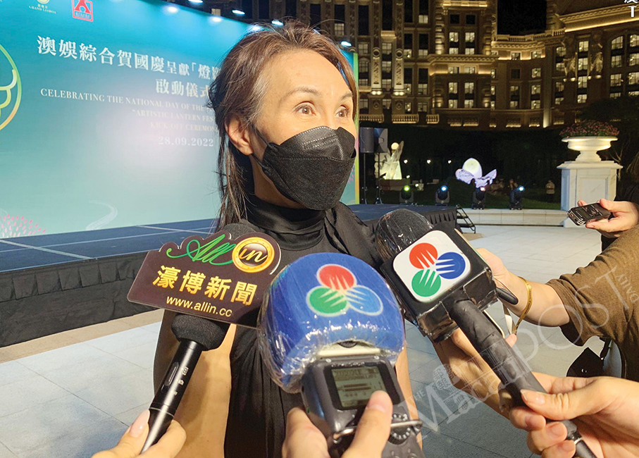 SJM Resorts Managing Director Daisy Ho Chiu Fung talks to reporters yesterday after the kick-off ceremony of “Celebration of Art & Culture – Artistic Lantern Festival” at Grand Lisboa Palace Resort Macau’s Secret Garden in Cotai.