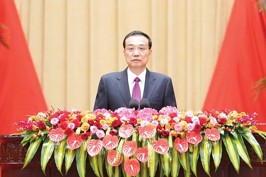 Caption: Premier Li Keqiang delivers a speech at yesterday's reception at the Great Hall of the People in Beijing to celebrate the 73rd anniversary of the founding of the People's Republic of China (PRC). Photo: Xinhua