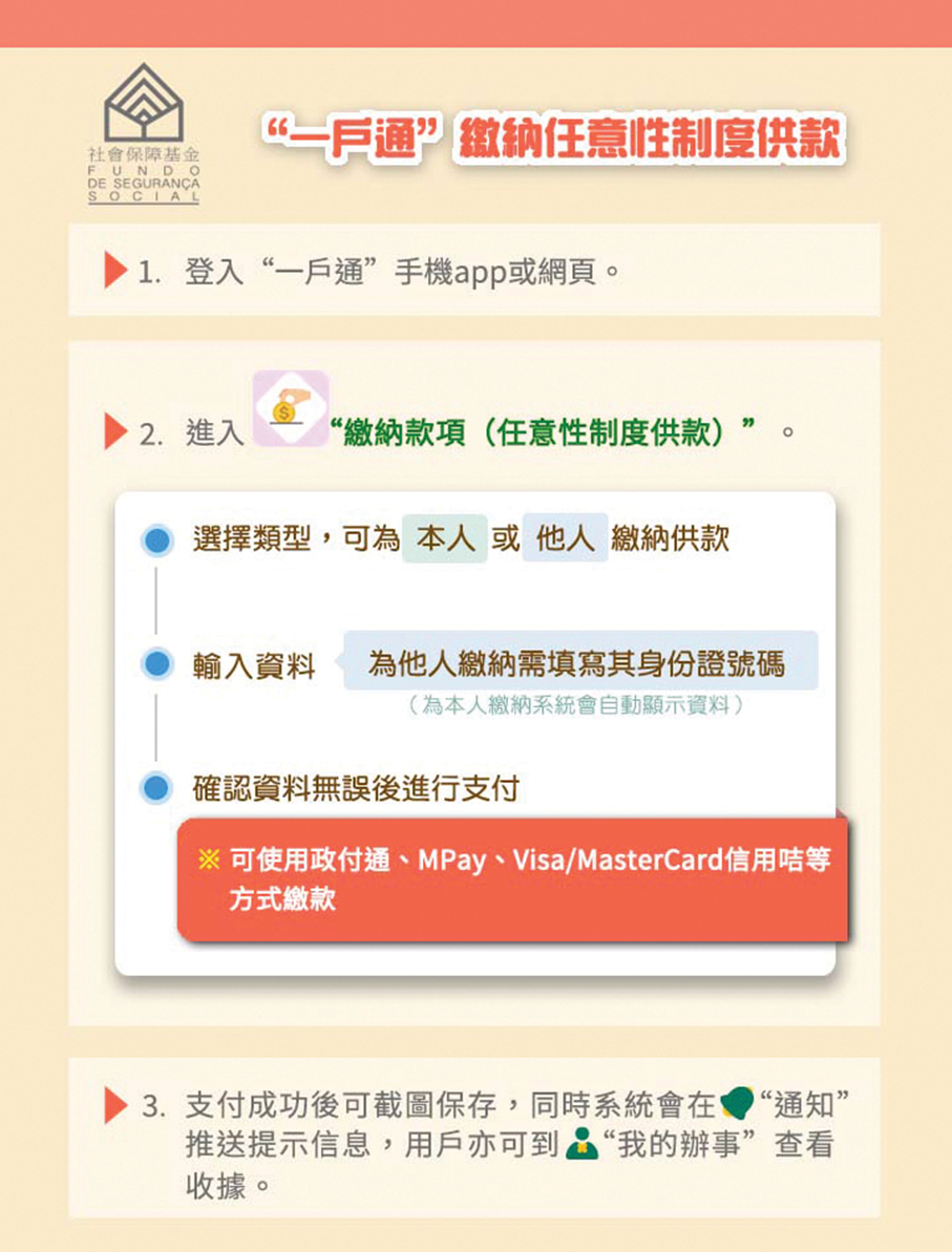 This poster provided by the Social Security Fund (FSS) yesterday shows steps for paying optional system contributions via “Macao One Account”.
