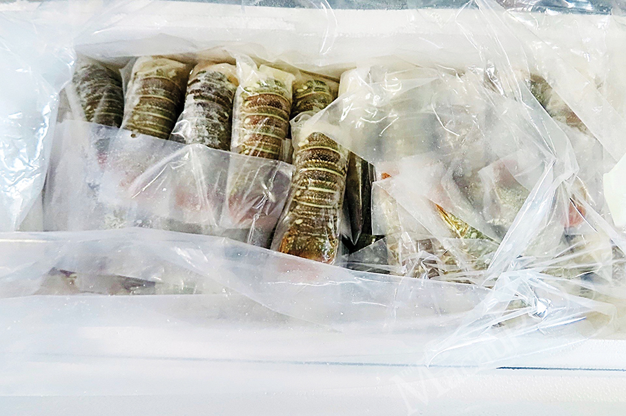 This undated handout photo provided by the Municipal Affairs Bureau (IAM) yesterday shows a box of frozen spiny lobster tails in a plastic bag.