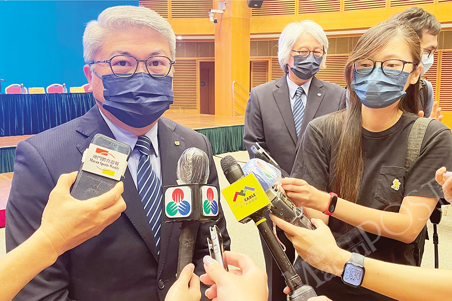 Sports Bureau (ID) President Pun Weng Kun talks to reporters after yesterday’s press conference about the 69th Macau Grand Prix at the Macao Science Centre in Nape.