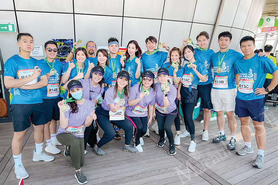 This handout photo provided by Oxfam shows runners posing with their medals at Macau Tower on Sunday.