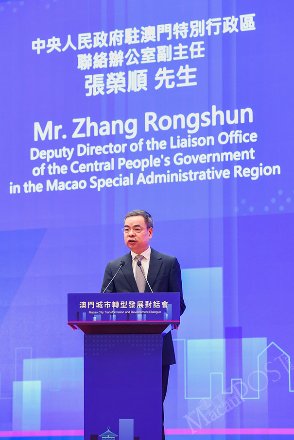 Zhang Rongshun, then still a deputy director of the Central People’s Government Liaison Office in Macau, delivers a speech during the “Macao Urban Transformation and Development Dialogue” in August jointly organised by the local government and the Office of the Foreign Ministry Commissioner in Macau, at the China-Portuguese-speaking Countries Commercial and Trade Service Platform Complex in Nam Van. – Photo: GCS