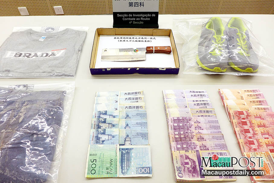 Cash, a cleaver, clothes and a pair of trainers seized by Judiciary Police (PJ) officers at the flat of the male Circle K robbery suspect from Indonesia are shown during yesterday’s press conference about the case, at the PJ headquarters in Zape. Photo: Iong Tat Choi