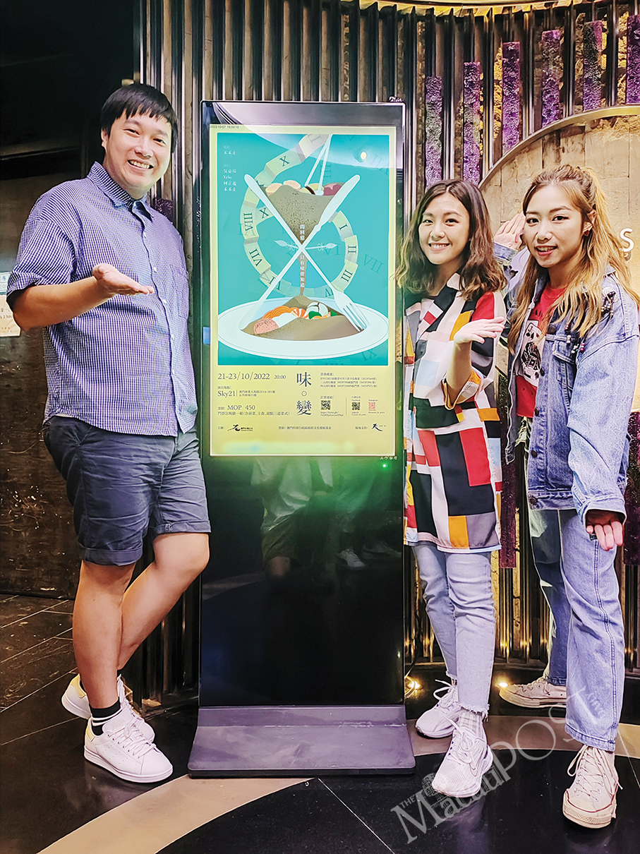 Ng Ka Wai (left), Ho Chi Iao (centre) and Yelo Wong Hio Cheng pose next to an electronic poster of their show at Sky 21 earlier this month. – Photo: William Chan
