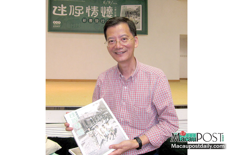 Albert Lai Hong Kin holding the book “Reminiscences of Old Taipa” at the book launch held at Carmo Hall in Taipa Village. Photo: Monica Leong