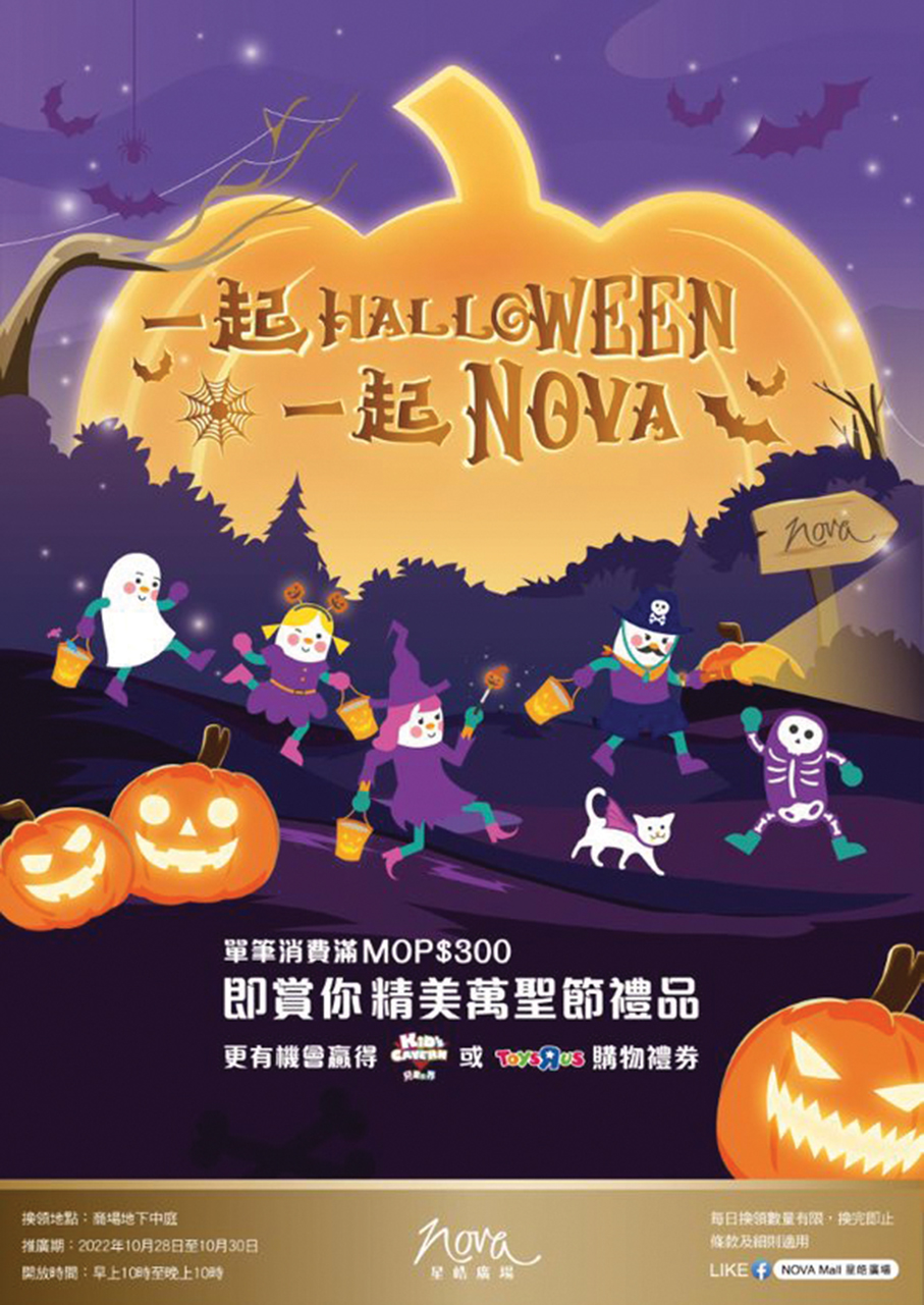 The statement said that customers spending 300 patacas or more are eligible to join the “Let’s Celebrate Halloween @NOVA Mall” Lucky Draw and have a chance to win cash shopping vouchers for Kid’s Cavern or Toys”R”Us from today through Sunday.