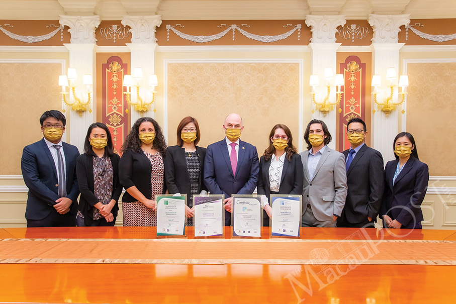 This undated handout photo provided by Sands China Limited shows its team members posing with the company’s four certificates awarded in this year’s Business Sustainability Indices (BSI) by the Chinese University of Hong Kong (CUHK).
