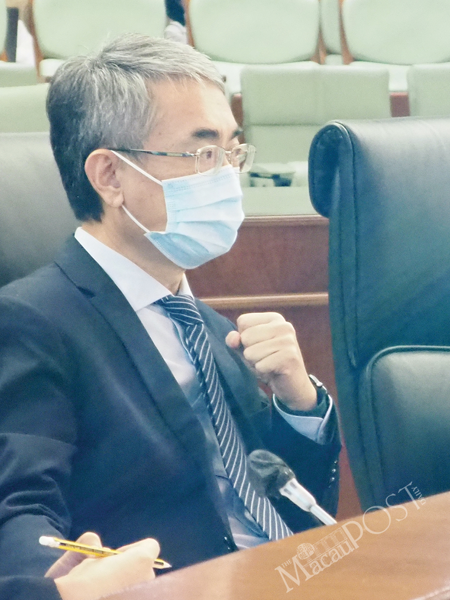 Secretary for Economy and Finance Lei Wai Nong addresses yesterday’s plenary session in the legislature’s hemicycle.