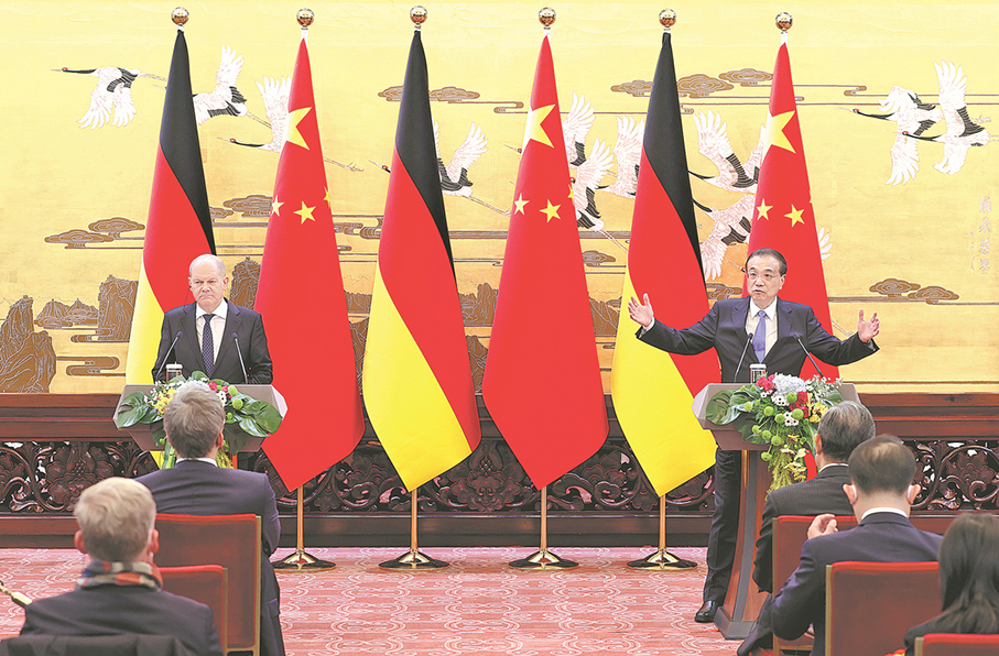 Caption: Premier Li Keqiang (right) and German Chancellor Olaf Scholz meet the press after their talks at the Great Hall of the People in Beijing yesterday. – China Daily