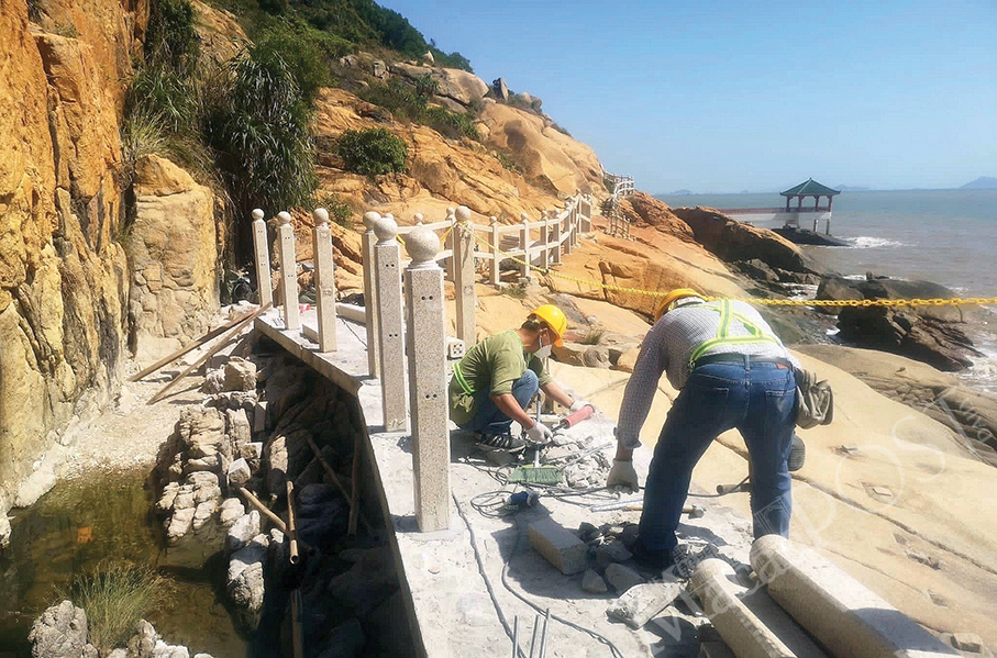This undated handout photo provided by the Municipal Affair Bureau yesterday shows two workers repairing fences along the Hac Sá Long Chao Kok Coastal Trail in Coloane.