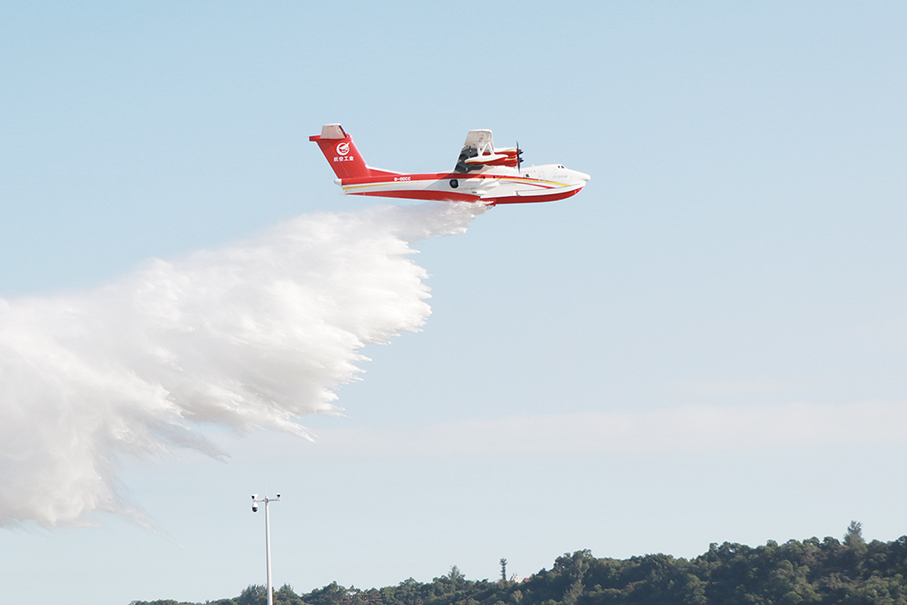 AG600M, the China-made amphibious firefighting aircraft called “Kunlong”, conducts a water-dropping demonstration at the 14th China International Aviation and Aerospace Exhibition in Zhuhai on Friday. The six-day airshow concluded yesterday. – Xinhua