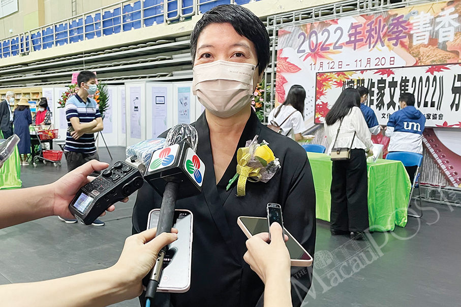 Cultural Affairs Bureau (IC) President Leong Wai Man talks to reporters after the kick-off ceremony of the Autumn Book Culture Festival at the Tap Seac Multisports Pavilion on Saturday. – Photo: Yuki Lei