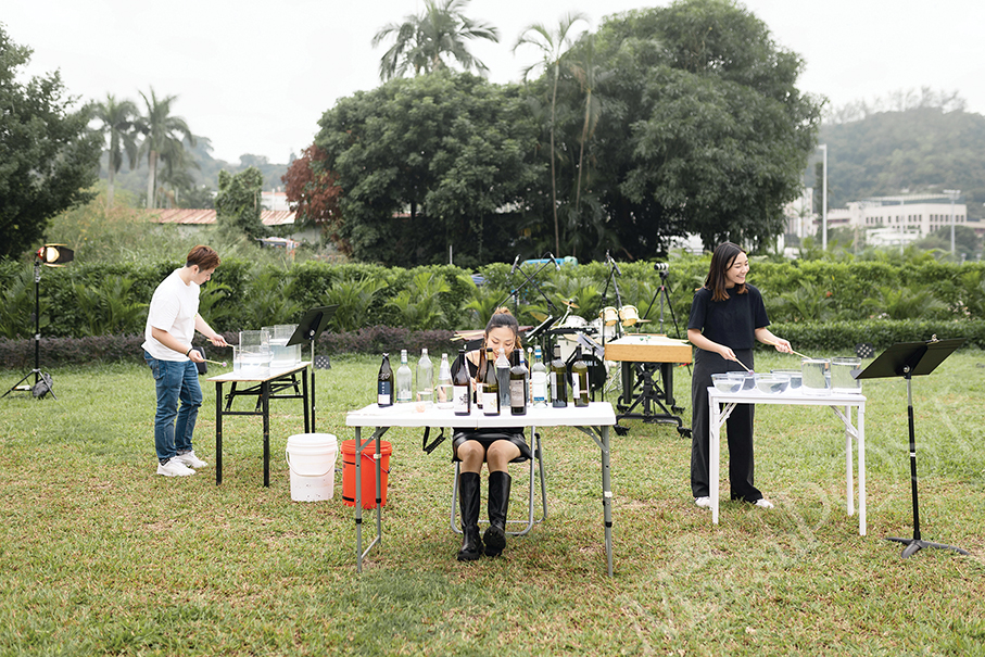 The Macao Percussion Association performs during their workshop at the Hac Sa Temporary Green and Leisure Area on Saturday afternoon. – Photo provided by Yukie Lai