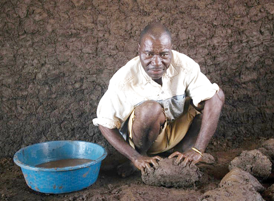Undated file photo of Patrício Alberto Mponda mixing water with mud to build the walls of his new home in Corrane, a site for displaced people. – Photo courtesy of UNHCR/Hélène Caux