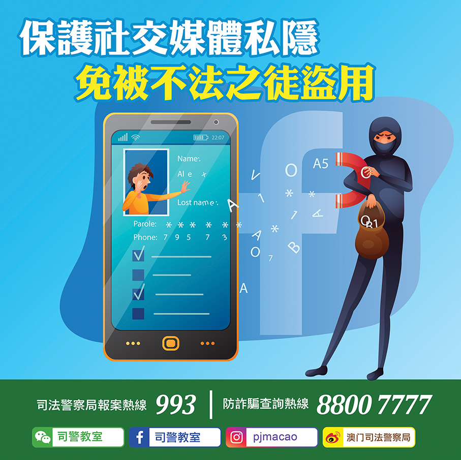 This poster provided by the Judiciary Police (PJ) yesterday warns the public to be wary of their personal information on social media platforms being stolen by criminals.