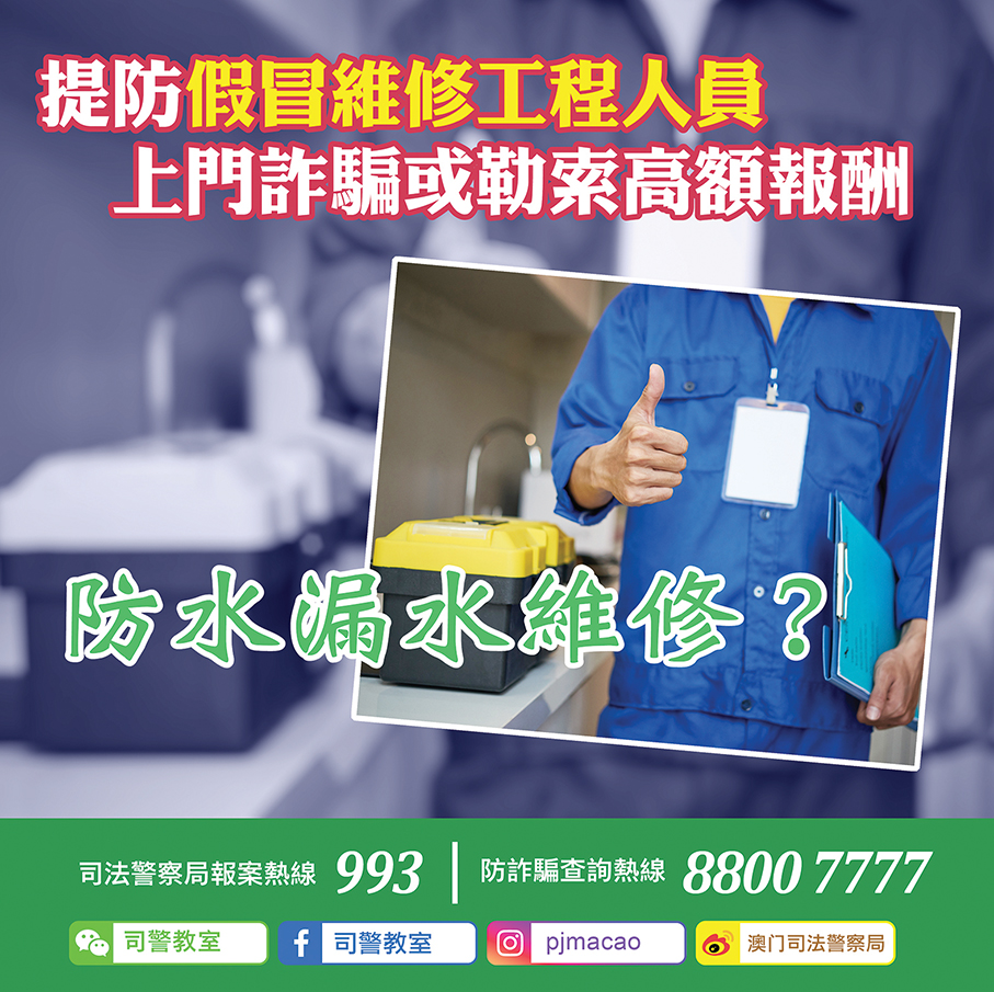 This poster provided by the Judiciary Police (PJ) yesterday warns the public to be wary of bogus “maintenance engineering personnel”.