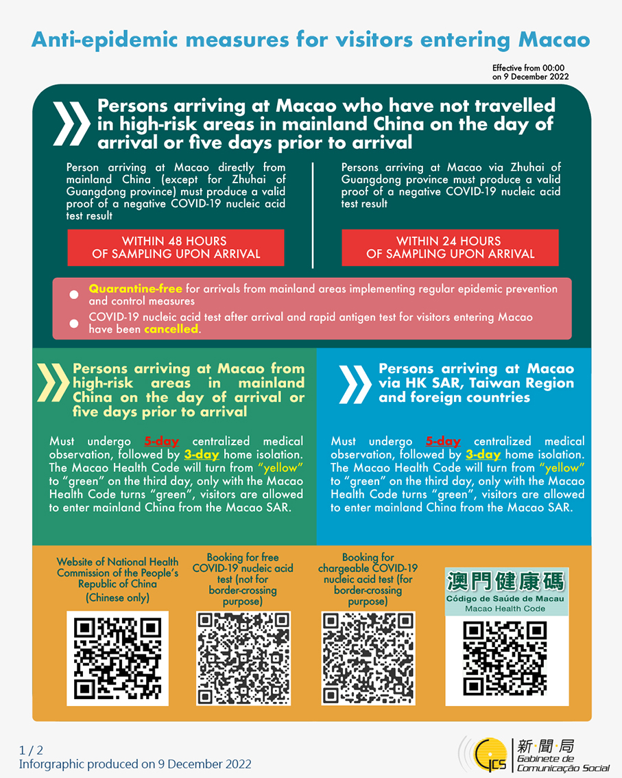 Currently, arrivals from the Chinese regions of Hong Kong and Taiwan and foreign countries need to go into five-day hotel quarantine and three days of self-health management. Health Bureau officials have signalled that the quarantine requirement for arrivals from Hong Kong could be lifted soon. Mainlanders arriving in Macau are not required to undergo quarantine here.