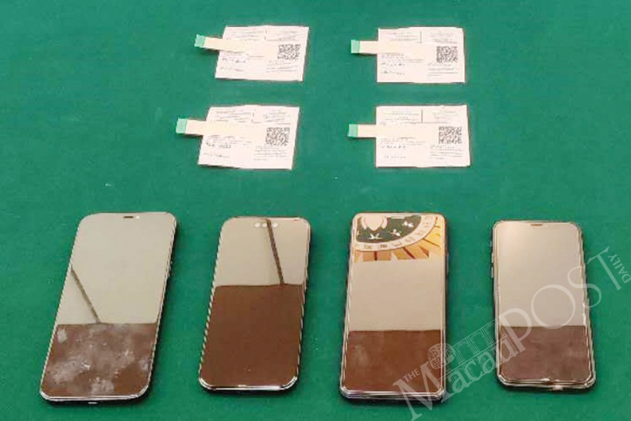 Fake Slips of Authorisation to Stay and the suspects’ phones are displayed at the Judiciary Police (PJ) headquarters yesterday. – Photos: William Chan