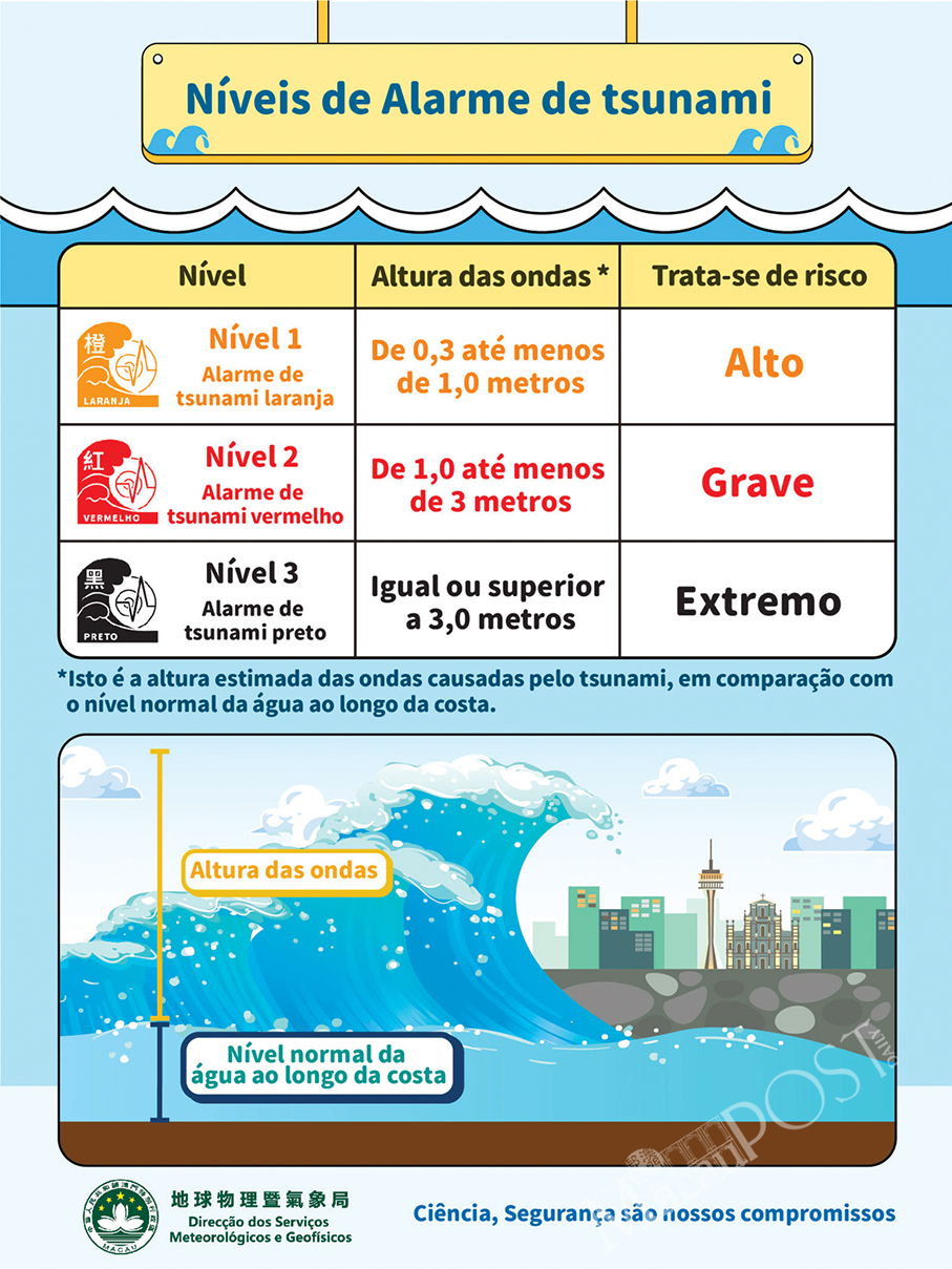 This poster provided by the Meteorological and Geophysical Bureau (SMG) yesterday shows Macau’s first tsunami alarm system, which will take effect next month, classified in three levels – Orange, Red and Black.
