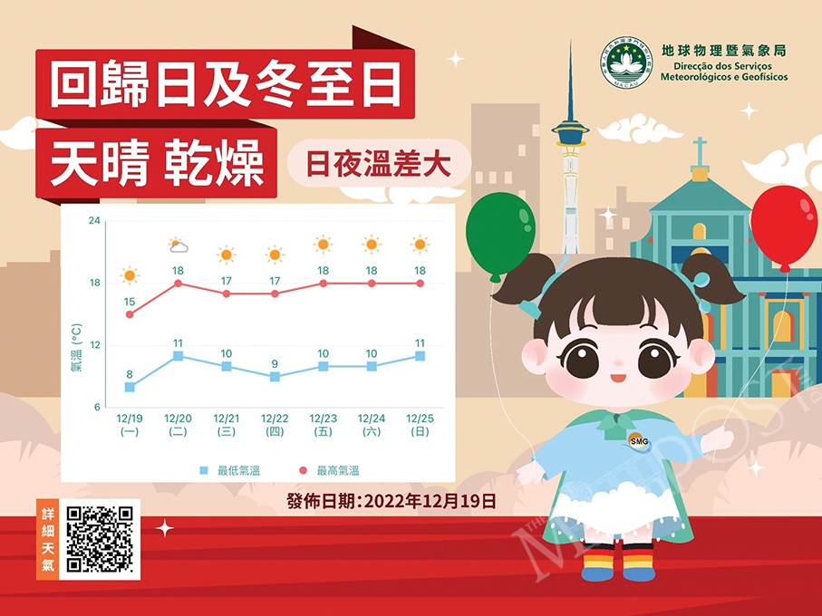 The strong winter monsoon over the weekend has brought strong winds and cold weather to Macau, the statement said, with the lowest temperature recorded on Big Taipa Hill over the past two days being 8.5 degrees Celsius, which was the lowest temperature so far this winter.