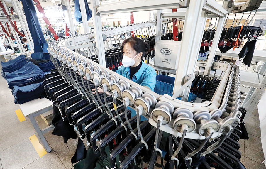 A staff member works at the production line of an apparel company in Shijiazhuang, Hebei province, yesterday. – Xinhua