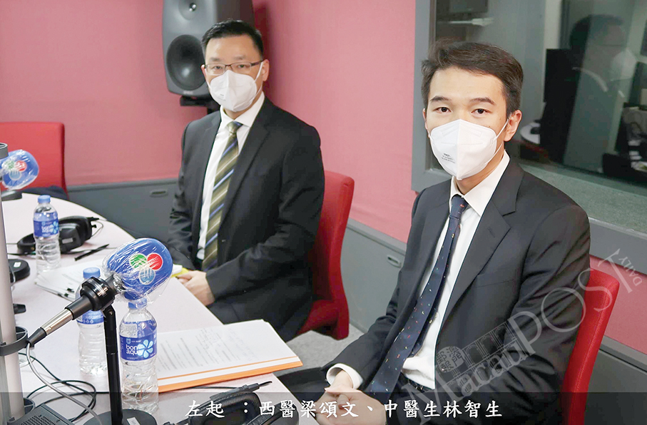 Public Conde de São Januário Hospital Centre Western-medicine physician Liang Sung Wen (behind) and traditional Chinese Medicine (TCM) practitioner Lam Chi Sang pose during yesterday’s phone-in programme hosted by public broadcaster TDM’s Chinese-language radio station, Ou Mun Tin Toi.