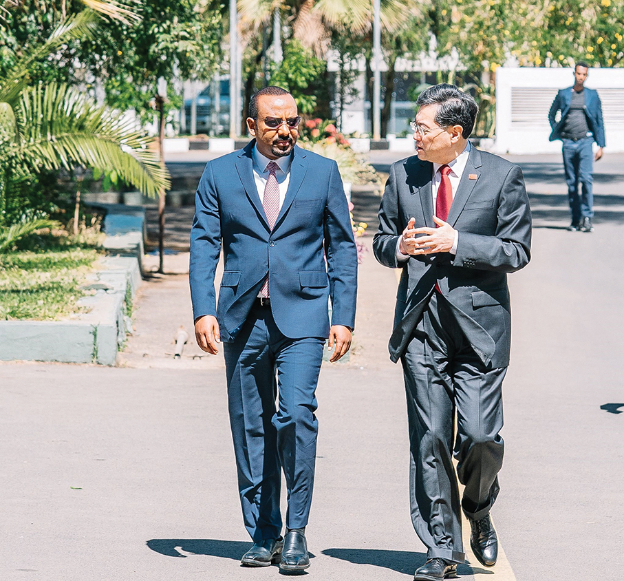 This handout photo taken and distributed by the Ethiopian Prime Minister’s Office in Addis Ababa yesterday shows Chinese Foreign Minister Qin Gang (right) talking with Ethiopian Prime Minister Abiy Ahmed during their working meeting at the Prime Minister’s office compound. Qian is on the Chinese foreign minister’s annual beginning-of-the-year trip to Africa. – AFP