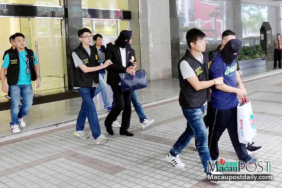 Two of the four suspects (hooded) in the HK$24 million tampered-with cards scam are being escorted by Judiciary Police (PJ) officers to a police van outside the PJ headquarters in Zape yesterday. Photo: Iong Tat Choi
