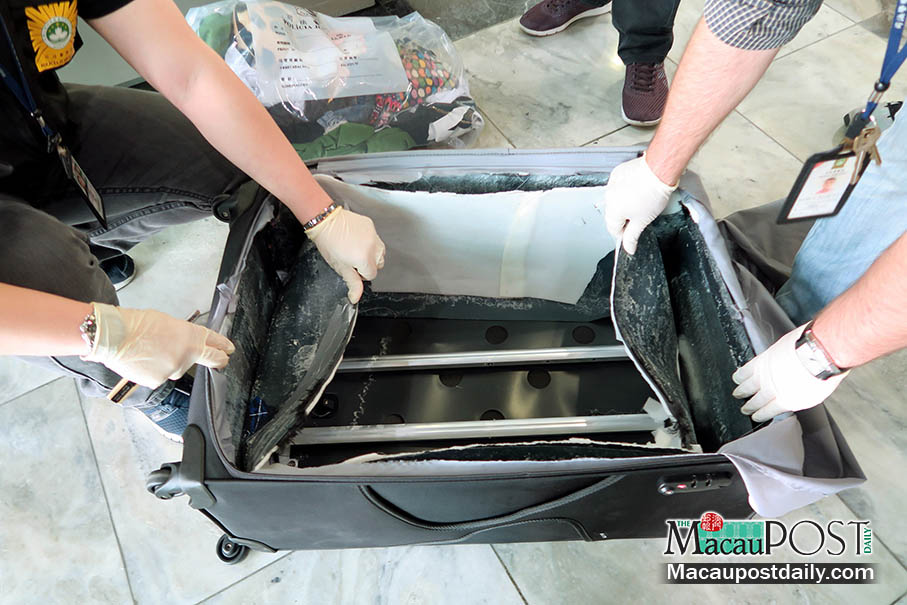 PJ officers show reporters the suspect's specially prepared drug-smuggling suitcase at the airport yesterday.