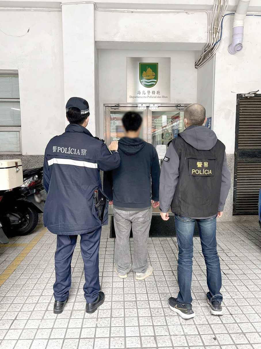 This undated pixilated photo provided by the Public Security Police (PSP) yesterday shows the suspect being escorted by police officers to a police station.