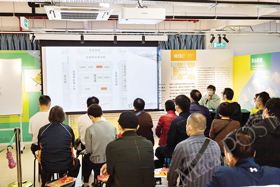 This undated handout photo provided by Macau Urban Renewal Limited (MUR) last week shows MUR representatives giving a presentation about the old neighbourhood renewal project to Seng I House property owners.