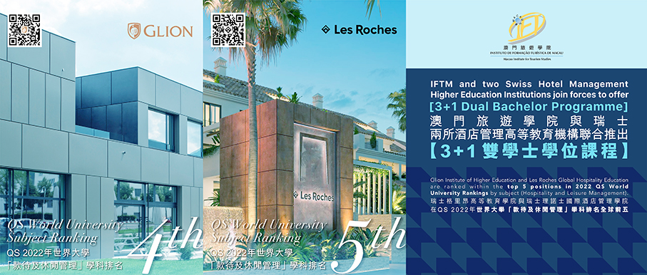 The Macao Institute for Tourism Studies (IFTM) said in a statement yesterday that it has recently signed an Articulation Agreement with leading Swiss institutions Les Roches Global Hospitality Education (Les Roches) and Glion Institute of Higher Education (GIHE) to provide a “top-up” study plan to IFTM’s Bachelor of Science in Hotel Management students following a “3+1” learning model.