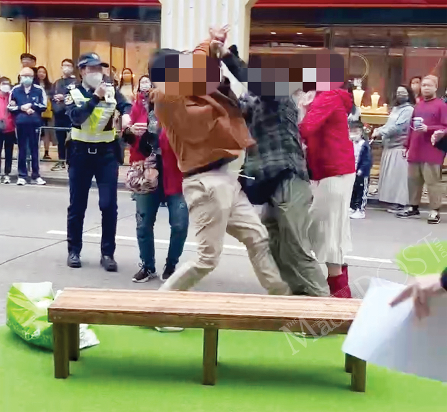 Responding to a video circulating on the internet showing two men throwing punches in San Ma Lou, the Public Security Police (PSP) said late last night in a message to local Chinese-language media that two local males, aged 35 and 65 respectively, were suspected of having quarrelled over queue-jumping while waiting to take photos with installations set up for the 5-day pedestrianisation of San Ma Lou.