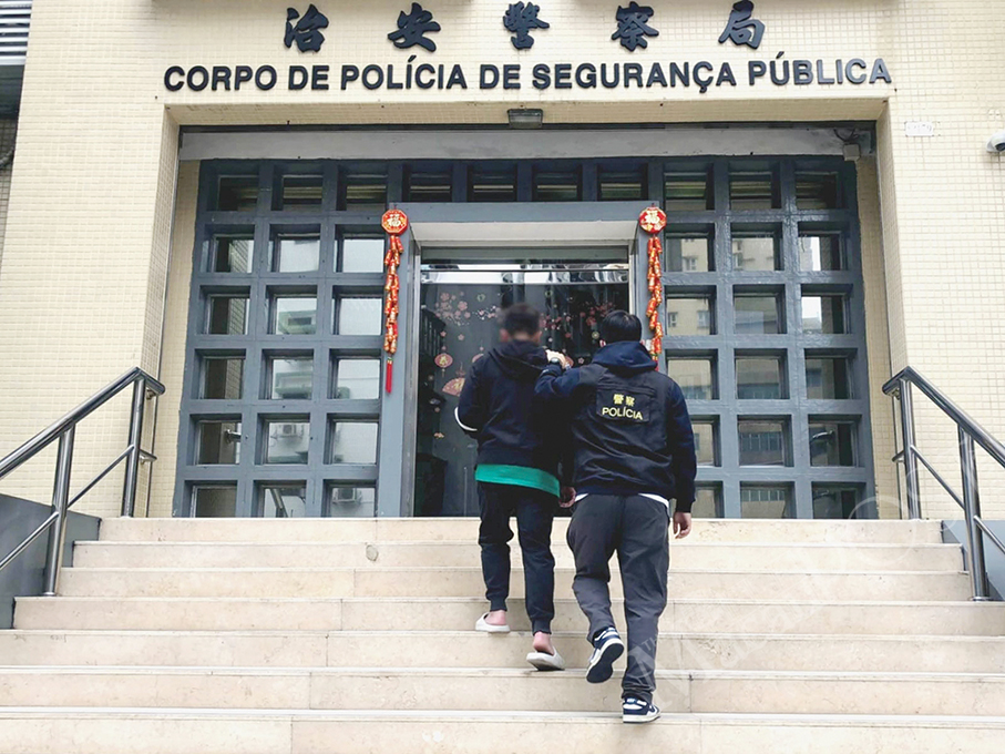 This undated pixelated handout photo provided by the Public Security Police (PSP) yesterday shows a PSP officer escorting the suspect to a police station.