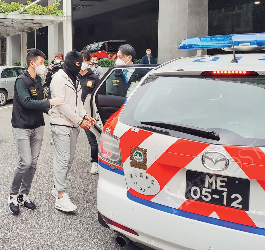 PJ officers escort the drug-taking and physical assault suspect from the mainland from the PJ headquarters to a vehicle yesterday. – Photo: Yuki Lei