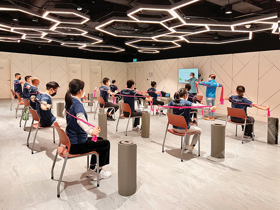 This undated handout photo provided by Melco on Monday shows participants in its recent “Get away from Strain Injury, Let’s Stretch Together” workshop.