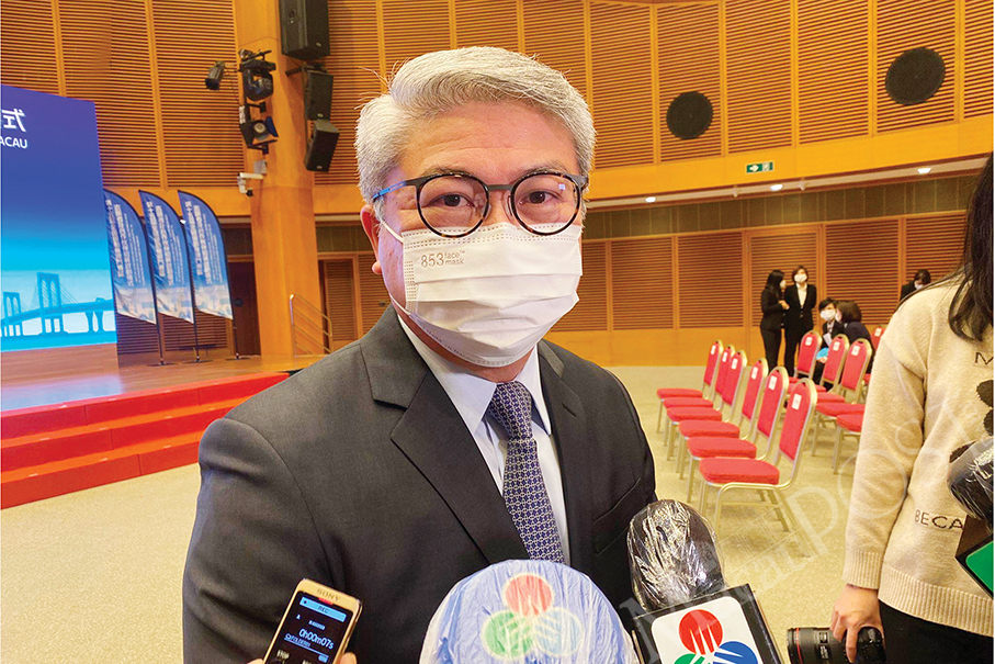 Sports Bureau (ID) President Pun Weng Kun talks to reporters after Friday’s 15th National Games volunteers’ recruitment ceremony at the Macau Science Centre in Nape. – Photo courtesy of TDM