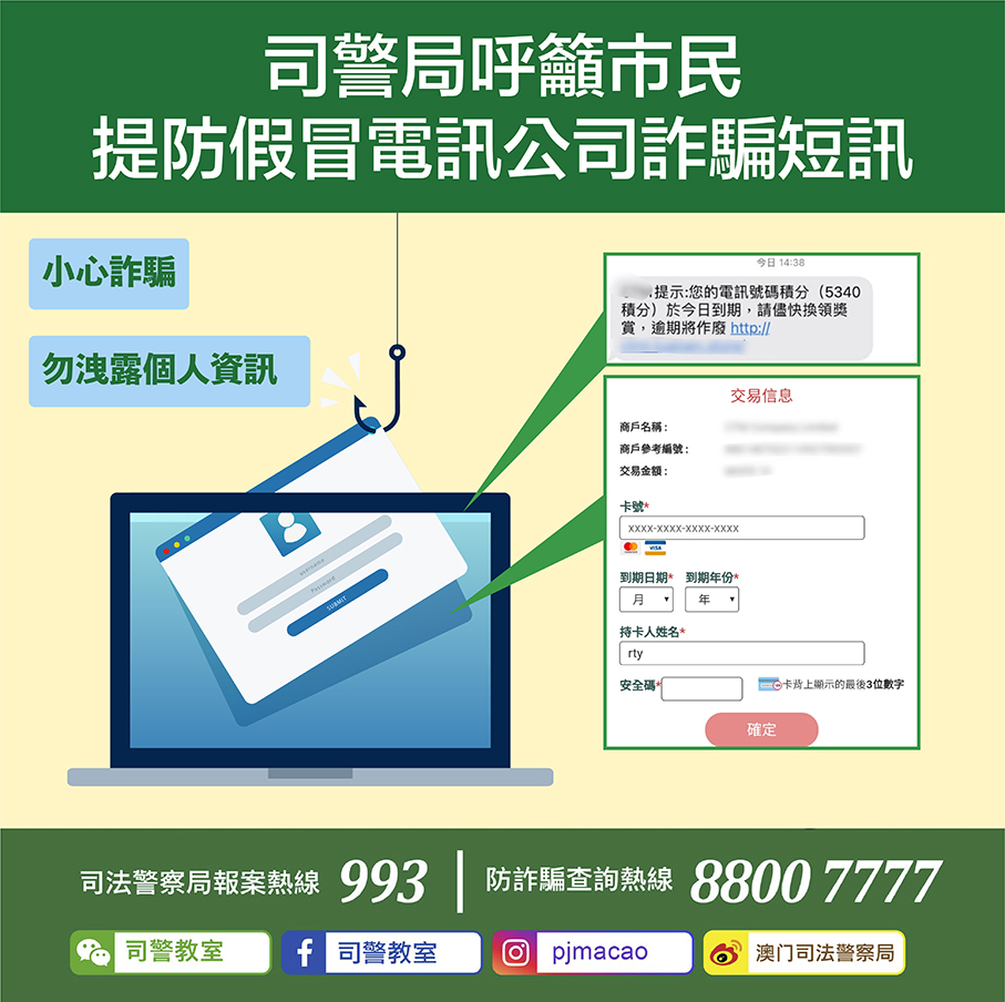 According to a PJ statement on Saturday, the Judiciary Police have recently received several reports from residents that criminals claiming to be staff members of a local “telecom company” had sent them fraudulent text messages with links to a website, which falsely claimed that their bonus points were due to expire soon, so as to lure the victims to log into the bogus website to redeem them. The statement added that the victims were asked to enter their credit card numbers and verification code as instructed by the website, after which they immediately received a notice from a financial institution pointing out that there was a suspicious transaction on the credit card, and it was suspected that the credit card details had been stolen from the website.