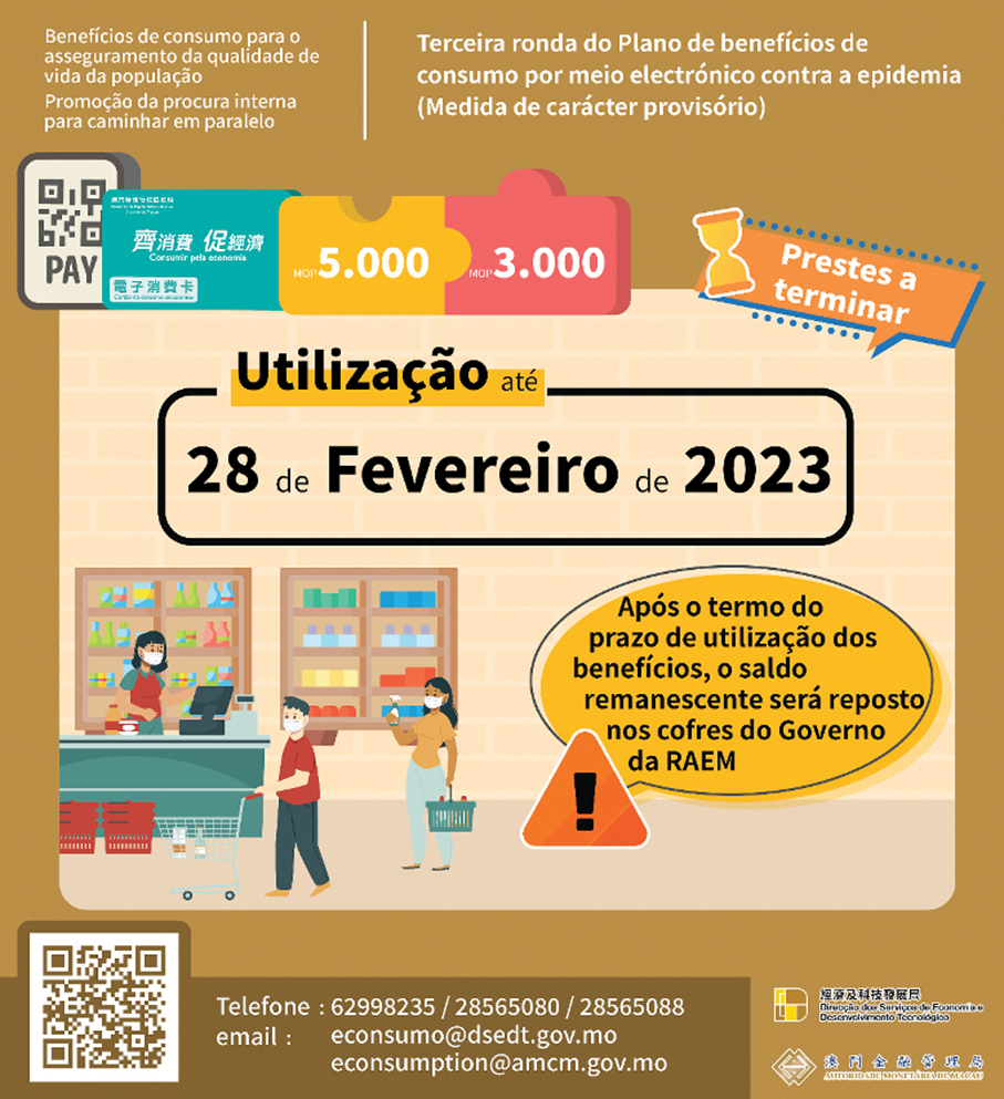 The e-consumption benefits scheme, consisting of a start-up fund of 5,000 patacas and a discount grant of 3,000 patacas on resident’s e-consumption smartcards or electronic devices, is slated to end on February 28.