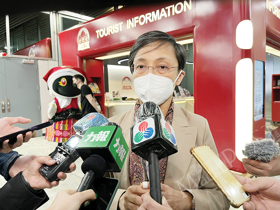 Macau Government Tourism Office (MGTO) Director Maria Helena de Senna Fernandes talks to reporters on the sidelines of Tuesday’s welcome ceremony for the first post-pandemic air passengers from Malaysia at the local airport. – Photo: MPDG