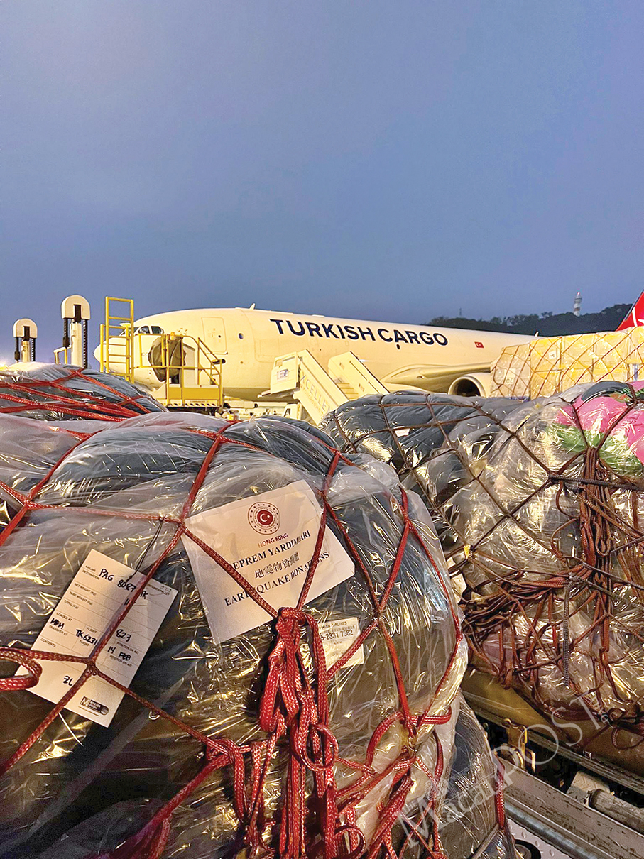 This undated handout photo provided by the SIMANG Association of Macau yesterday shows supplies donated for earthquake victims in Turkey, in front of a Turkish Cargo plane.