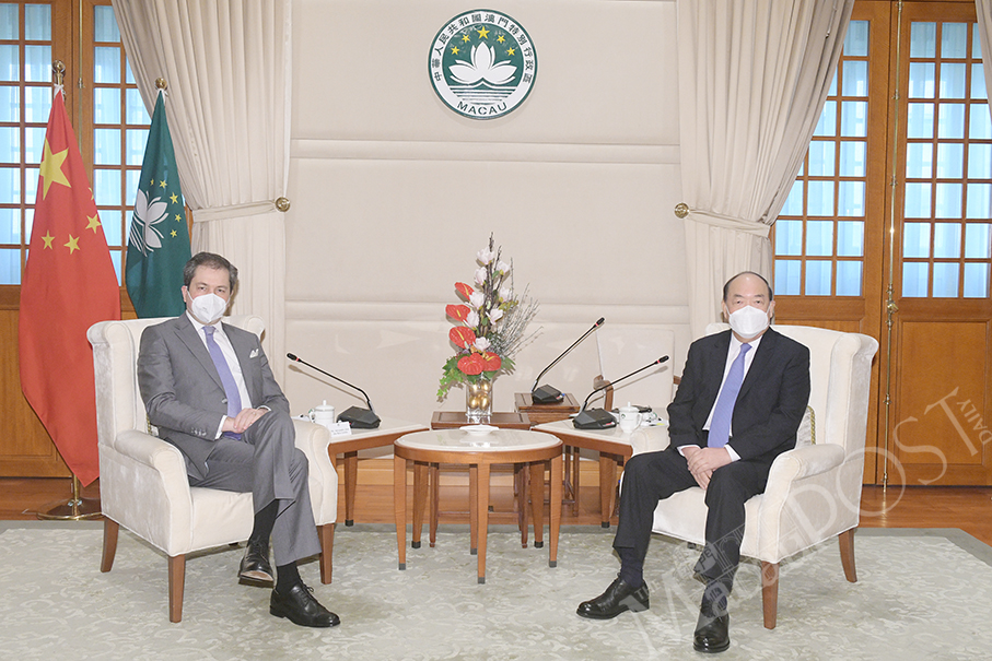 Caption: Macau Special Administrative Region (MSAR) Chief Executive Ho Iat Seng (right) and Portugal's new Consul-General Alexandre Leitao meet at Government Headquarters yesterday. – Photo: GCS