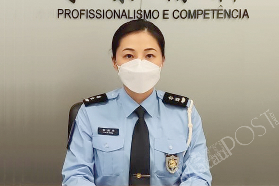 Public Security Police (PSP) spokeswoman Lai In Hong looks on during yesterday’s press conference.