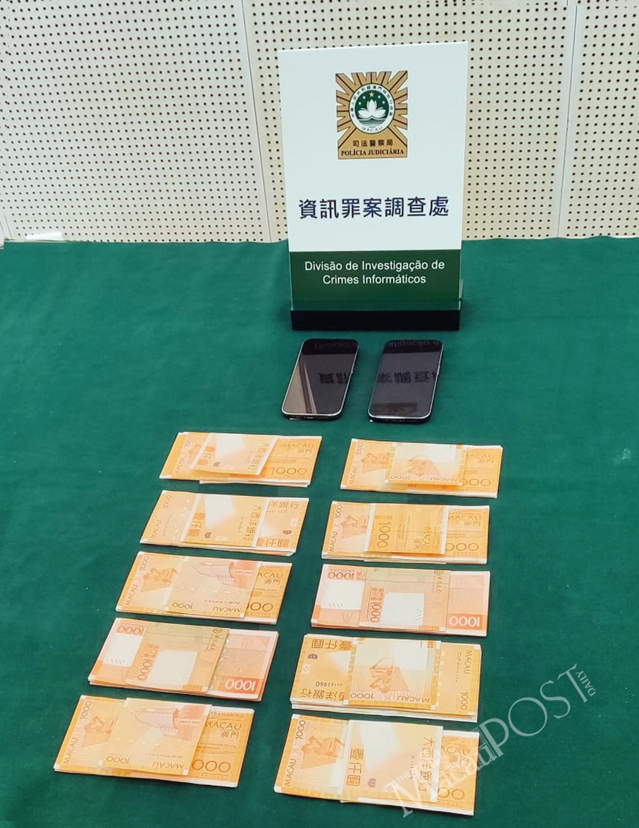 Pataca notes and smart phones seized from the high-school suspects are displayed in a pressroom of the Judiciary Police (PJ) headquarters yesterday.