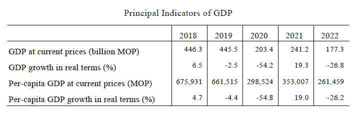 In 2022, GDP amounted to 177.3 billion patacas and per-capita GDP stood at 261,459 patacas (US$32,415). The implicit deflator of GDP, which measures the overall changes in prices, grew 0.4 percent year-on-year for the whole year of 2022 and 1.1 percent for the fourth quarter.