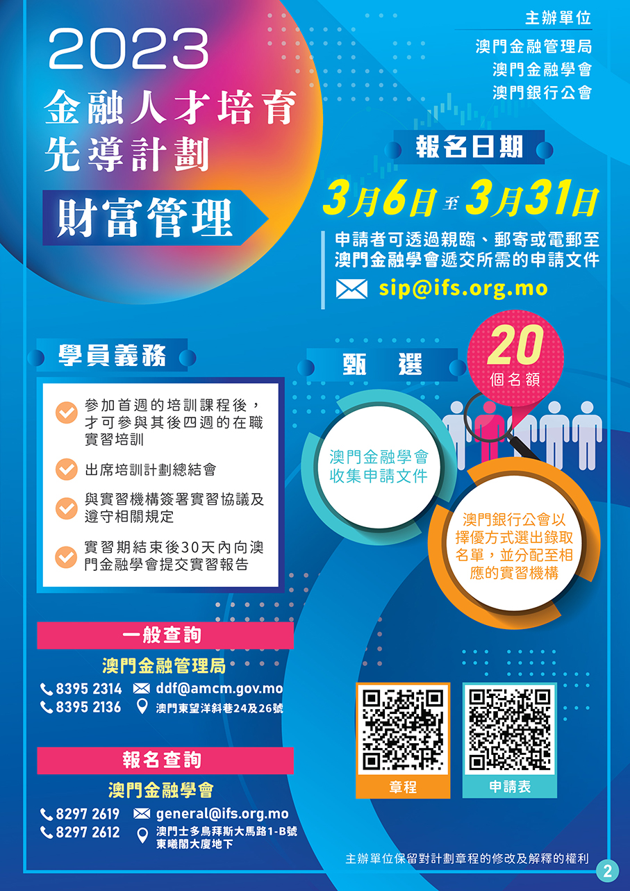 The programme, in line with the government’s policy objective of focusing on the development of wealth management, is co-organised by the Macau Institute of Financial Services (IFS) and the Association of Banks in Macau (ABM).