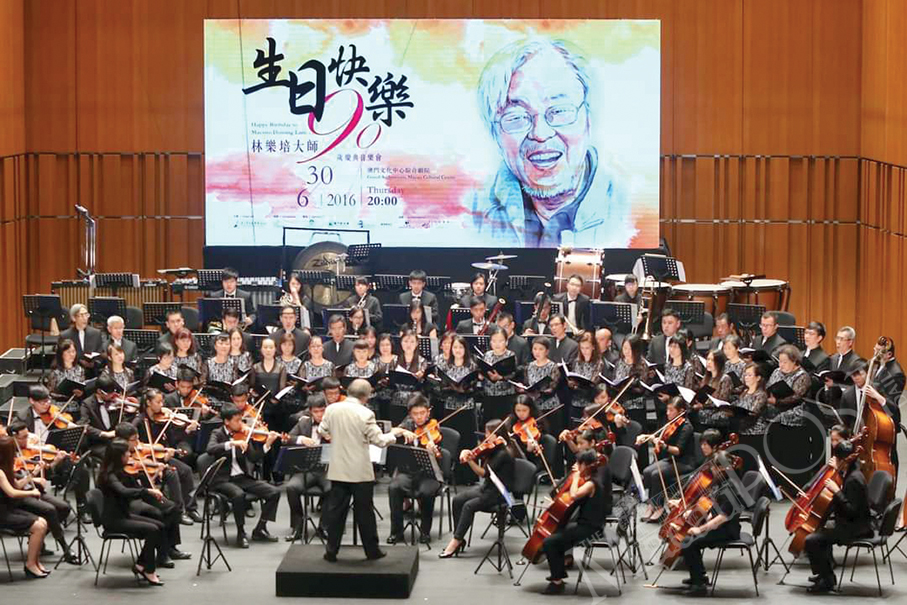 The Macau Youth Symphony Orchestra (MYSO) and Coro Perosi perform together during the “Happy Birthday to Maestro Doming Lam” concert in June 2016 at the Macau Cultural Centre’s Grand Auditorium.