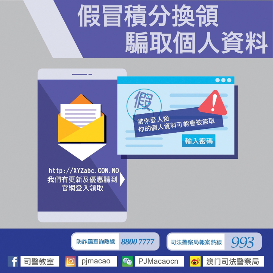 The Judiciary Police (PJ) issued a statement yesterday to warn residents of phone message scams where fraudsters send out messages posing as a consumer reward and points platform, claiming that the victims’ reward points will expire soon and can be redeemed for gifts, so as to trick victims into logging on to a fake website to obtain their personal information and credit card details.