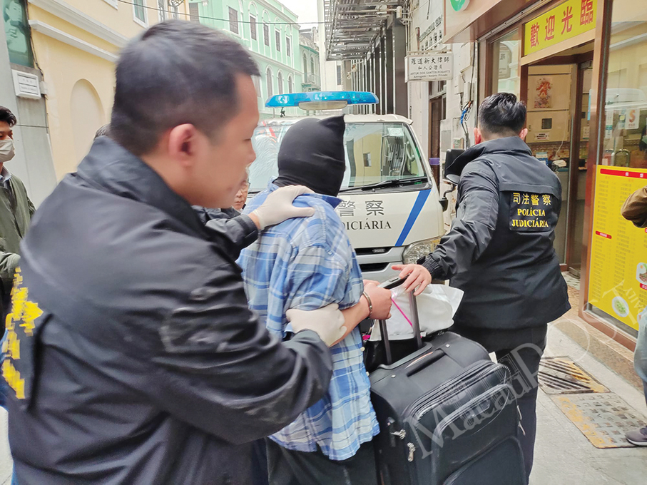 Judiciary Police (PJ) yesterday escort the hooded Hong Kong murder suspect carrying luggage from the hotel where Sunday’s homicide occurred to a vehicle.